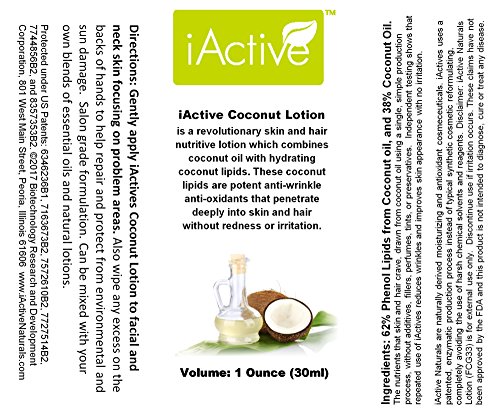 FCG33 Coconut Lipid Anti-wrinkle Antioxidant Lotion for Skin and Hair, 1 Oz., iActive Naturals Coconut Phenol-lipids in Natural Coconut Oil