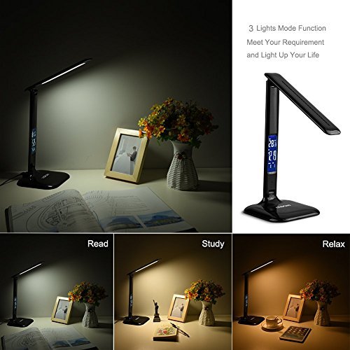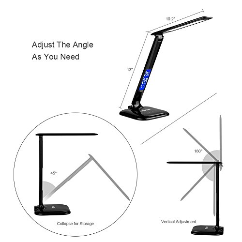 -. Feature : EYE CARE: Bright and eco-friendly LED lighting with an anti-glare shade. 5 levels of adjustable brightness for clear reading and studying without eye strain. / THREE MODULES: 3 colors temperature available(Warm White/Nataural White/Cold White) for work(office), reading(study), relaxation(bedroom) and more. / LCD FUNCTION: Includes a digital clock for time, date and temperature display. Set an alarm or time for your lighting with minimal desk clutter. / Touch-Sensitive Control: Button-free design for easy control over power, lightness and color temperature with the touch-sensitive panel. / FOLDABLE & ENERGY SAVING: Available to fold 180°cover and 90°arm vertically. Save 1/3 electricity bill.(1 Year Warranty)
