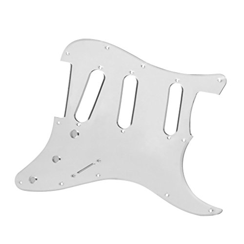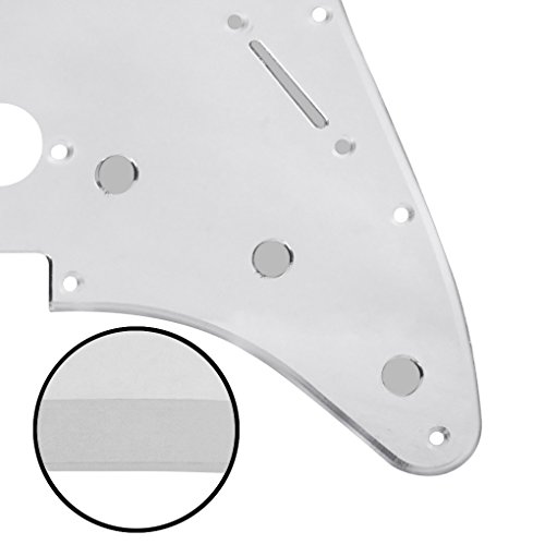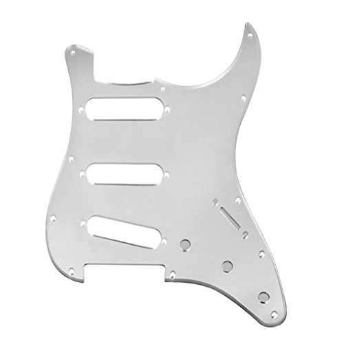 Product Description Feature: * For US Modern Fender Strat Stratocaster style guitar or similar.* With pure aluminum foil shield on the backside, not the common aluminum-foil paper on the market, better shielding property and anti-interference.* All materials are environmentally friendly, thermostability, no smell. Multi-layer plates are pressed under high temperature and pressures, to make them close integration between each layer, will not appear curly, deformation, or separation of different layers.* Excellent product process ensure the edge of the smooth and structured.Two layers of protective films on the front of pickguards, anti-scratch to protect the guitar.Specification:* Style: SSS(single/single/single coil) style pickguard; 11 screws holes in the side of pickguard.* Material: 1Ply Acrylic PVC* With pure aluminum foil shield.* Color: Silver Mirror* With protective film on the surface, while using please split it off.* Note:Item's color might be different from the picture because of the aberration.Package Includes:1 x guitar pickguard 0