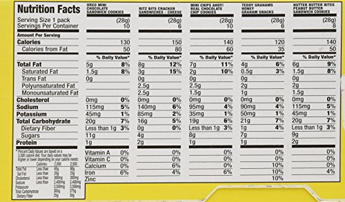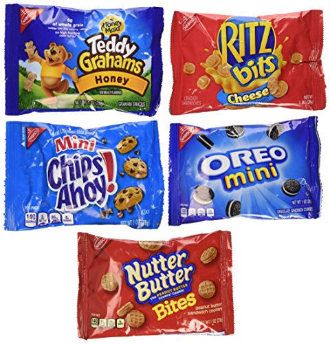 -. Feature : 10- 1 oz packs Mini Oreo Chocolate Sandwich Cookies / 6 - 1 oz packs Teddy Grahams Honey Graham Snacks / 10 - 1 oz packs of Mini Chips Ahoy! Real Chocolate Chip Cookies / 6 - 1 oz packs Ritz Bits Sandwich Crackers Cheese / 8 - 1 oz packs Nutter Butter Bites Sandwich Cookies Peanut Butter