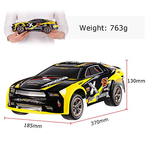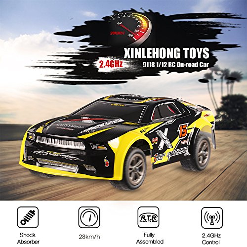 Specifications: Brand name: XINLEHONG TOYS Item NO.: 9118 Item name: High Speed RC On-road Car Material: ABS Color: Yellow and Red for option Scale: 1/12 ? Drive System: 2 wheel drive Remote control frequency: 2.4GHz (Lefthand and righthand mode optional) Max. speed: 28km/h Transmitter battery: 2 * 1.5V AA battery (not included) Car battery: 7.4V 500mAh Li-ion battery (included) Remote control distance: About 80m Charging time: About 100mins Working time: About 10mins Suitable age: Above 8 years old Wheelbase: 210mm Wheel diameter: 70mm Wheel width: 35mm Ground clearance: 35mm Battery size: 40 * 25 * 12mm Car size: 370 * 185 * 130mm (artificial measurements error allowed) Car weight: 763g (battery included)