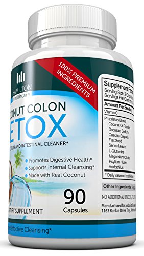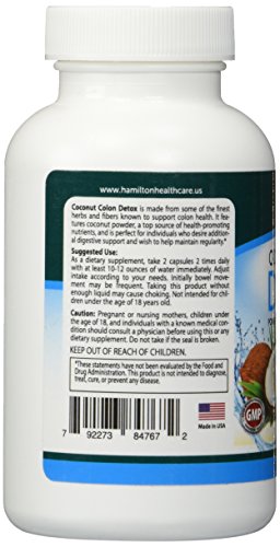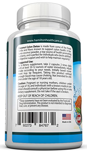 - Feature : GENTLE YET EFFECTIVE- Hamilton healthcare's All Natural Proprietary formula is scientifically designed to induce Smooth Bowl Movements. Enjoy a Safe, Painless and Natural detoxification. You do get what you pay for! Lower quality Colon Detox products may cause Cramps, Bloating or Diarrhea. Our colon detox is specially formulated to assist with digestive problems. Manufactured in an FDA non-GMO USA based laboratory. / RESEARCHED NATURAL ACTIVE INGREDIENTS. While numerous brand names of diet detox products are made using a range of stimulants and harsh laxatives, our Coconut Detox is made with whole foods, natural herbs and other plant products that have actually been utilized for centuries which have actually been extensively and just recently shown through clinical research. Through a mix of plant-based fibers, gentle, natural laxative aids and a host of antioxidants and metabolic rate enhancers, Hamilton Healthcare's Coconut Colon Detox speeds metabolism, eases bowel movement, detoxes the liver and kidneys, carefully scours the walls of the colon and supplies your body with a wealth of antioxidants to help recover immune health. / 30 DAY DETOX DIET - LOSE WEIGHT - This product is a purifying and rigorous cleanse that removes waste matter from the digestive tract that may have accumulated over a period of several years. The detoxifying process leaves you feeling healthy and fresh. When you rid the body of waste matter, it is very common to experience an immediate drop in both weight and waist size! This particular detox is extremely effective. / HIGHEST QUALITY - Hamilton Healthcare does not compromise on ingredients or quality control. All of our supplements are Manufactured in a USA GMP Certified Facility and are Third Party Tested for Purity - Made only from A grade, all natural herbs, spices, seeds and other plants. High in effective anti-oxidants such as Vitamin A, Vitamin E, Vitamin C and the B-vitamin group. Loaded with insoluble fiber to speed metabolic processes and clean the lower bowel of harmful accumulation. Including Real Coconut, We chose coconut because it is naturally high in fiber and also an amazing natural laxative. Yes you can buy a cheaper option, but just remember you do get what you pay for. / 100% MONEY BACK GUARANTEE - When you order our Coconut Colon Detox today, you're protected by a 60 day, no-questions asked money back guarantee and world class customer service!!