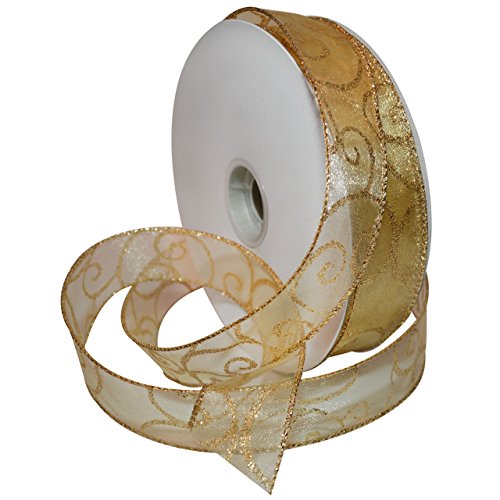 Morex Ribbon 7416.40/50-634 Swirl French Wired Sheer Ribbon, 1-1/2-Inch by 50-Yard Spool, Gold