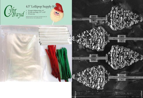Cybrtrayd 45stK50C-C038 Tree Lolly Christmas Chocolate Mold with Lollipop Kit and Molding Instructions, Includes 50 Lollipop Sticks, 50 Cello Bags, 25 Red and 25 Green Twist Ties