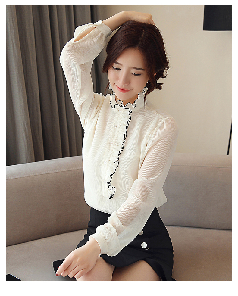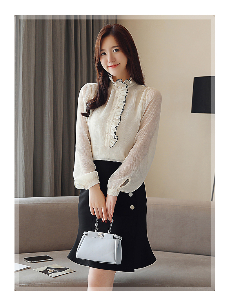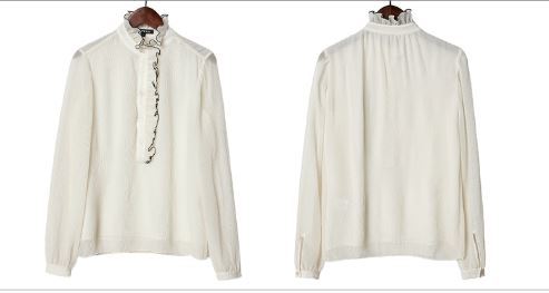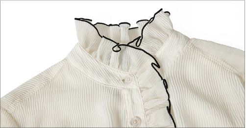 フリルのスタンドカラーデザインがフェミニンなシフォンブラウスです。