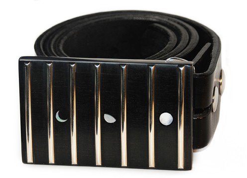 Studio : BCA Publisher : BCA Product Description BCA's One-Of-A-Kind Original Guitar Buckles are handcrafted from premium guitar fret-boards, fused to a metal buckle. This buckle features a premium ebony fingerboard with pearl inlays in a Moon phase sequence. No two buckles are the same but the buckle shipped will be very similar to the buckle showcased. Buckle Size: .25" x 2" x 3.25". Note: the leather belt is not included. 0