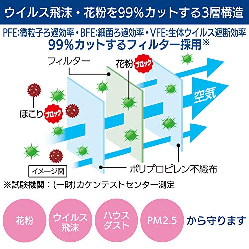 材質:本体・ポリフィルター/ポリプロピレン 耳ひも/ポリウレタン、ポリエステル ノーズフィッター/ポリプロピレン