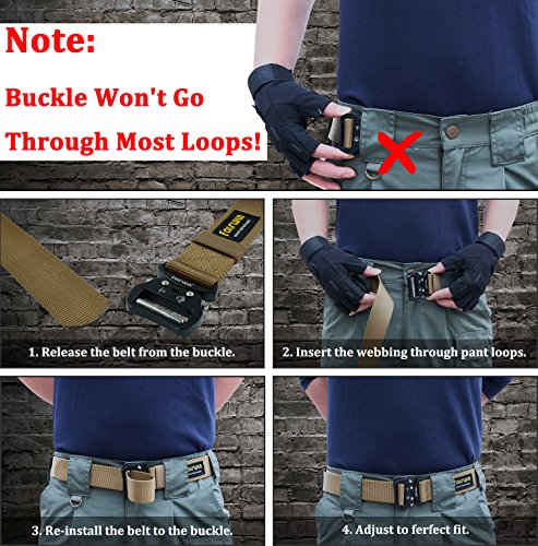 Buckle note:?While we find the belt to work well with some?belt loops, most?belt loops can be too small to fit the buckle through. In this case, each time you want to take the belt on/off a pair of pants, please remove the male end of the buckle, loop the nylon through the belt loops, then re-install the male buckle.