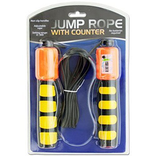 Studio : China Publisher : China Binding : Toy Product Description JUMP ROPE WITH COUNTER NON-SLIP HANDLES SKU #1944340 Jump Rope with Counter Non-Slip Handles Great for sports training and fitness exercise, this Jump Rope with Counter features a counter on the handle that counts jumping times and comfortable, easy to hold rotator swivel action non-slip handles that allow you to jump smoothly. Rope length can be adjusted according to your height. No batteries required. Counter has a 0-999 setting range and an easy reset button. Comes in assorted colors. Comes packaged in a blister pack. Assorted Colors Colors: Blue, Orange Materials: Plastic, Foam Wholesale Exercise Equipment 0