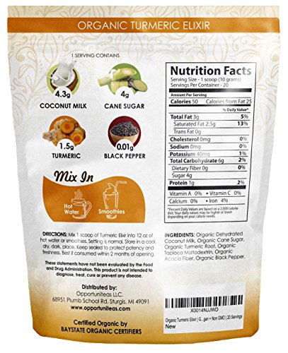 DELICIOUS GOLDEN MILK TASTE - Our turmeric elixir is incredibly delicious because it’s made using creamy organic coconut milk powder, sweet organic cane sugar, and savory turmeric root powder. Most turmeric root powders or golden milk supplements don’t taste very good. Our Organic Turmeric Elixir tastes great and is non gmo, vegan, gluten free.