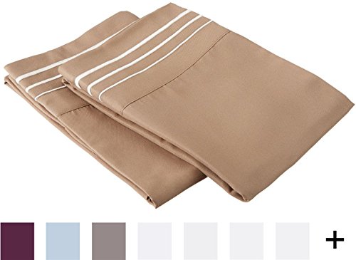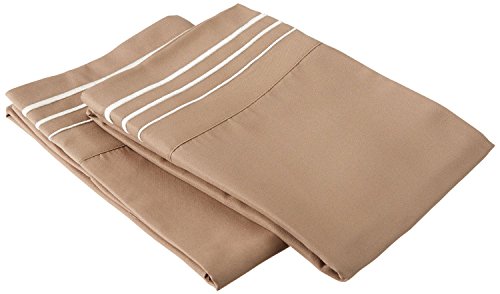 Super Soft Light Weight, 100% Brushed Microfiber, Standard, Wrinkle Resistant, 2-Piece Pillowcase Set, Taupe with Ivory 3-Line Embroidery Detail