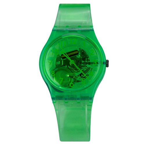 Transparent green plastic case with a green translucent silicone strap. Fixed transparent green bezel. Green translucent dial with green hands and Arabic numeral hour markers. Minute markers around the outer rim. Dial Type: Analog. Quartz movement. Scratch resistant mineral crystal. Pull / push crown. Green translucent case back. Case diameter: 33 mm. Case thickness: 8 mm. Round case shape. Band width: 15 mm. Tang clasp. Water resistant at 30 meters / 100 feet. Casual watch style. Swatch Limade Green Translucent Dial Green Translucent Silicone Unisex Watch GG216.Feature