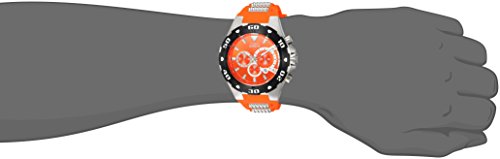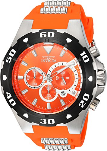 Stainless steel case with a orange polyurethane strap with stainless steel inserts. Fixed black ion-plated bezel. Orange dial with luminous silver-tone hands and index hour markers. Minute markers. Tachymeter markings around the outer rim. Dial Type: Analog. Luminescent hands and markers. Date display between the 4 and 5 o'clock positions. Chronograph - three sub-dials displaying: 60 second, 60 minute and 24 hour. Caliber: VD53 quartz movement. Scratch resistant flame fusion crystal. Pull / push crown. Solid case back. Case size: 52 mm. Case thickness: 15 mm. Round case shape. Band width: 30 mm. Band length: 8 inches. Tang clasp. Water resistant at 100 meters / 330 feet. Functions: chronograph, tachymeter, date, hour, minute, second. Casual watch style. Invicta Pro Diver Chronograph Orange Dial Mens Watch 24680.Feature