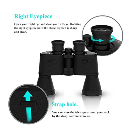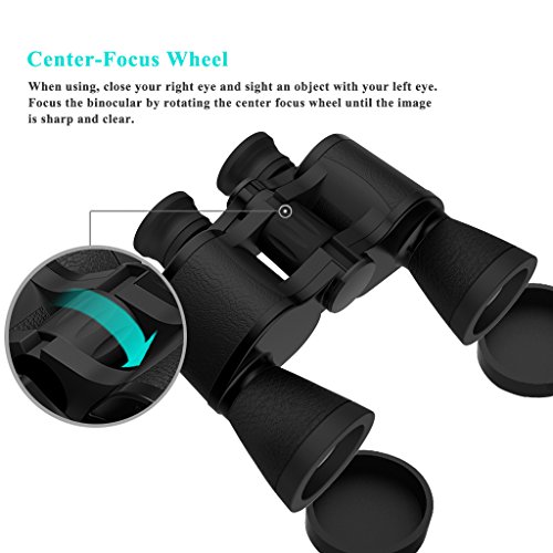 Considerate Design: This telescope has a center-focus wheel, turn-and-slide non-slip rubber eyecups, flip-down lens caps. It is equipped with user-friendly features such as turn-and-slide rubber eyecups, a smooth central focus knob and flip down lens caps.