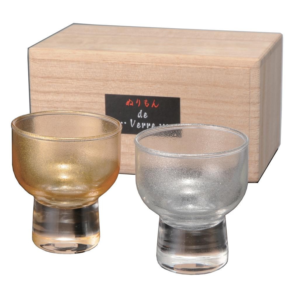 おもてなしの食卓に新鮮な輝きを放つジャパニーズ・モダンな器です。大切な方への贈り物や記念品としてもおすすめです。 製造国:日本 素材・材質:ガラス 商品サイズ:φ5.6×6.5cm 仕様:電子レンジの使用:不可食器洗浄機の使用:不可容量:70ml セット内容:グラス×2 ※サプライヤー直送品 ご注文後2~3営業日後の出荷となります【商品名】ぬりもん de Verre 盃 涼金/涼銀ペア 桐箱入り 0770026