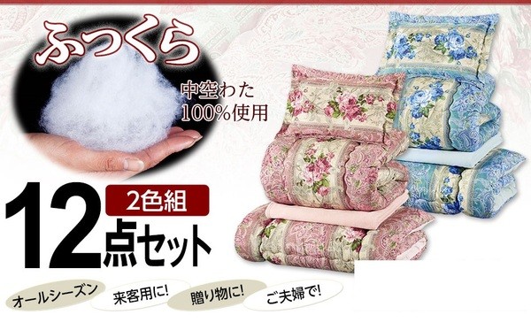 【商品名】毛布付き中空わた布団12点セット 【2: シングル/ボリューム2色組(ピンク/ブルー(青))】 収納ケース付き