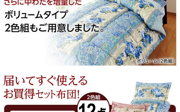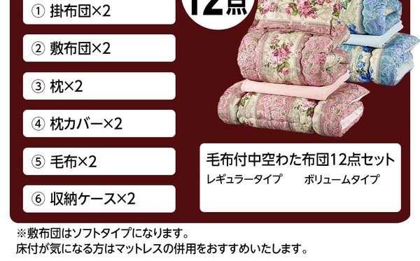 ■ ボリュームタイプ中わた量約(kg)/掛布団:1.68、敷布団:2.76、枕:0.4