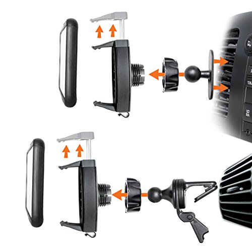 -. Feature : The miniPro Vent is a Universal car holder with that easily clips securely to your vehicle's air vent. Fits all Smartphones, from an iPhone 4 up to an iPhone 6+ with a case. Attach directly to dashboard using "miniBall" or clip on to your car's airvents. / High quality iBOLT car mount for iPhone 5/6/6+ and Android handsets. Keep your Phone in a secure and easy to view position. Great for GPS Navigation & music streaming. Works with thick Cases like Otterbox Defender (Except on Large phones, such as, Samsung Note Series). Easy 1-hand insertion. Open camera view. Attach to Vent OR dashboard with adhesive miniBall. Free Dock'n Drive App. Type in "ibu-33411" on YouTube to see video demo. / COMPATIBILITY: Fits all Smartphones incl. iPhone 4/5/6/6+ and Samsung Galaxy S4, S5, Note 4. From 58mm-94mm (2.2"-3.7"). Works with most Cases too. / FUNCTIONALITY: Press the sP.R.Ing loaded latch to the right when inserting vertically. Turn cradle and push latch up or down if inserting phone horizontally. / TWO MOUNTING OPTIONS: Kit includes Vent mount clip and adhesive miniBall mount to mount anywhere on your dashboard