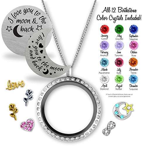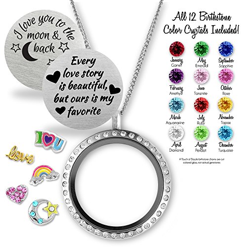 -. Feature : Genuine quality lockets manufactured to the highest standards for long lasting enjoyment --- P.R.Ime quality stainless steel and glass floating locket necklace, 22 inch chain with 2 inch extender / Perfect MOTHERS DAY gifts from daughter, grandma, son, or husband for your daughter, nana, or wife. / Locket includes exclusively designed custom plate, charms, and birthstone color crystals presented in a beautiful gift box / Premium Lockets come with a full set of Birthstone color crystal charms / Charm Packs come with all of the charms and plates shown in the picture plus a hinged charm storage case
