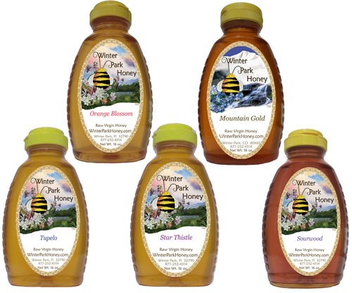 -. Feature : Try 5 of our favorite honeys for sweeteing tea. / One pound each of our raw Tupelo, Orange Blossom, Star Thistle, Mountain Gold, and Sourwood honey / All of our honey is raw, unheated and unfiltered. / Honey straight from the comb to the bottle. / We consisitently win first place in honey taste contests.