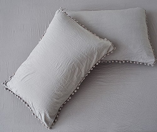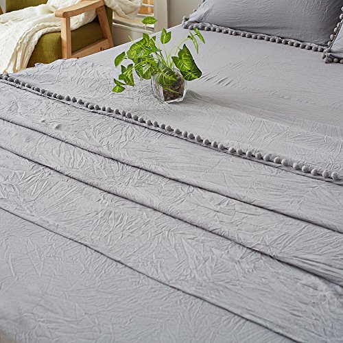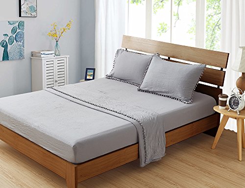 Pom poms Fringe Flat and Fitted Sheet Set Meaning4 Polyester Full or Queen Size Light Gray or Grey 4 pcs(1 Flatsheet + 1 Fittedsheet + 2 Pillowcase)