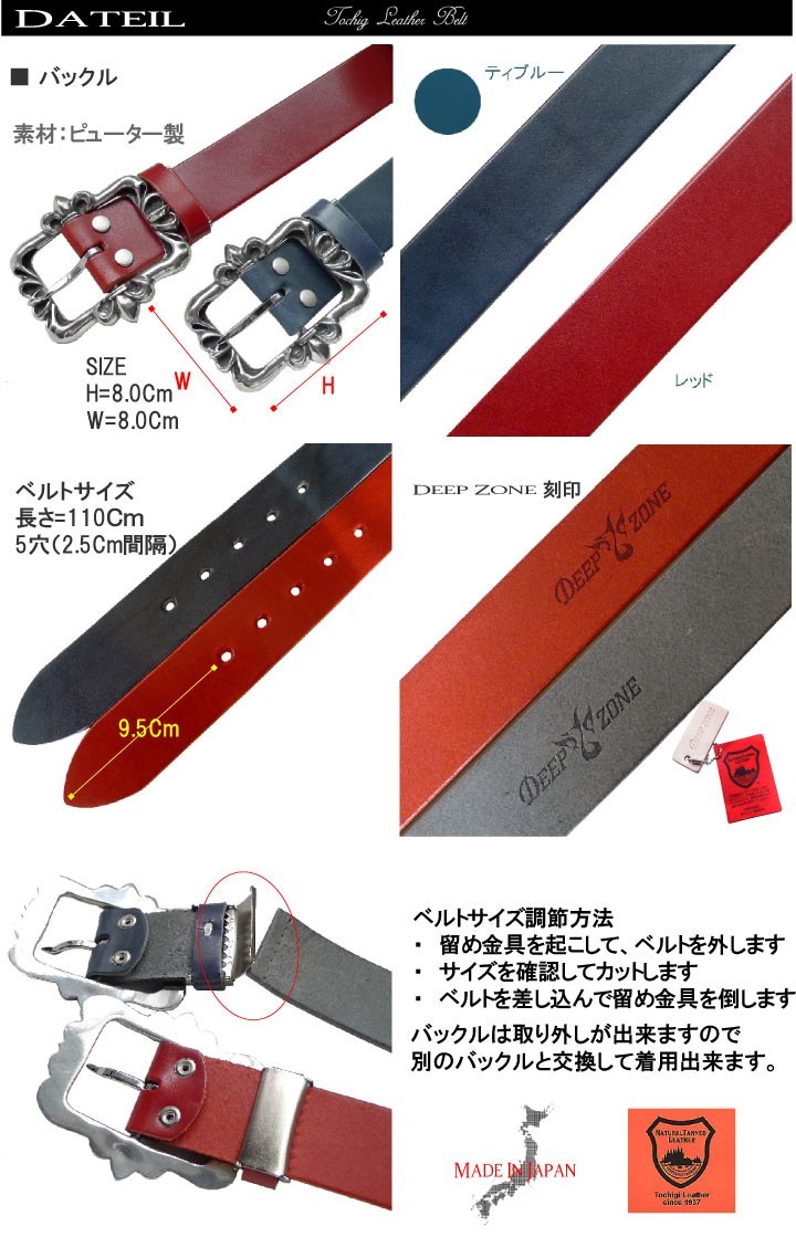 [素材]ベルト:牛革(栃木レザー)バックル:ピューター[ベルトカラー] ティーブルー・レッド日本の職人による「頑なまでに守り続けた「伝統」と「技」 からのみ生み出された『最高峰の技術』『魂』の栃木レザーベルト。「フルベジタブルタンニングレザー」を使用し、日本の熟練した職人が一つ一つ丁寧に作っています。使い込むほどにさらに深みのある革へと変化するので、自分で育てて行く楽しみも持ち合わせます。[Deep Zoneオリジナルバックルはインパクトバツグン!