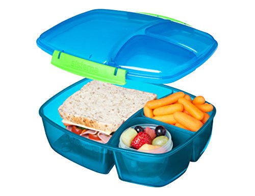 Blue triple split lunch box includes a yogurt pot with twist and seal lid in blue; holds 67.63 ounces or 8.45 cups; measures 9.6 x 7.8 x 3.6 inch