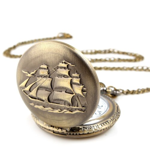 -. Title : FuzzyGreen Unisex Antique Vintage Case Brass Rib Chain Quartz Sailing Boat Pattern Pocket Watch