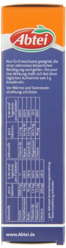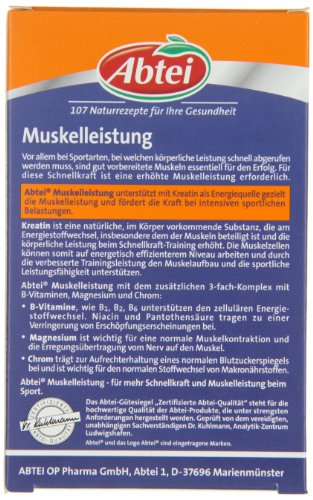 -. Feature : Unterstützt mit Kreatin als Energiequelle gezielt die Muskelleistung und fördert die Kraft bei intensiven sportlichen Belastungen. / 3-fach-Komplex mit B-Vitaminen, Magnesium und Chrom. / Nahrungsergänzungsmittel mit Kreatin, Vitaminen und Mineralstoffen. / Für mehr Schnellkraft und Muskelleistung beim Sport. / PZN: 2641329 Abtei - 107 Naturrezepte für Ihre Gesundheit.