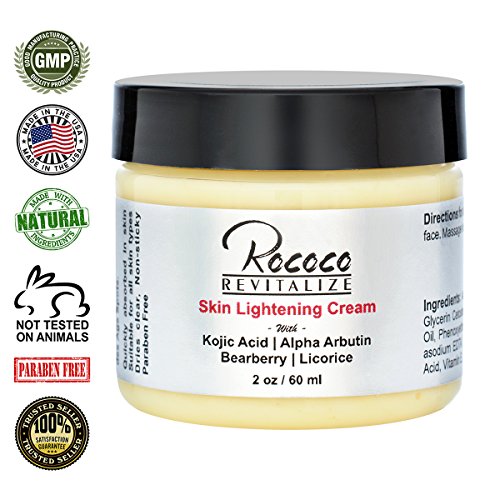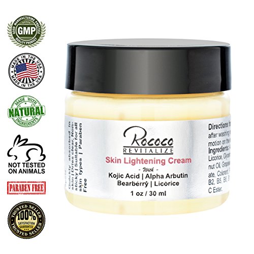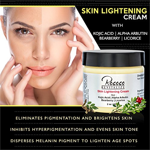 Skin Lightening Cream with Kojic Acid Alpha Arbutin Bearberry Licorice It works to give you fair skin, reduce skin pigmentation and remove brown spots on skin. It is a great skin lightener with bleaching properties. It works miracles on both your face and your body including problematic areas such as dark underarms and lips. The Kojic Acid in this cream is a naturally occurring oriental beauty product extracted from mushrooms with phenomenal skin-lightening abilities along with acting as an antioxidant which counter the environmental particles which damage your skin. Kojic acid helps to prevent the formation of signs of aging that occur when the cells that produce the skin's vital structural proteins become damaged. It is also an anti bacterial agent thus addressing acne blemishes, which are often caused by bacterial infections in the pores. Alpha Arbutin; a glycosylated hydroquinone extracted from the bearberry plant prevents the formation of melanin and contributes to skin-lightening. Together with Bearberry and Licorice, which are naturally occurring anti oxidants and skin lighteners, these two ingredients ensure that your skin is moisturized, fresh and young at all hours!