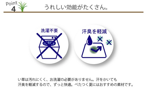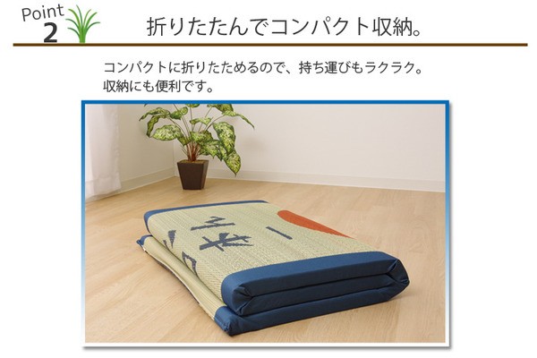 寝っころがってテレビを見たり、折りたたんで腰かけたり、リビングでのお昼寝用に、などいろいろな使い方ができるフリーマットです。お仕事のちょっとした休憩時間にも最適です。い草には1.綿の約2.5倍の吸湿性があり汗のじめじめを軽減します。2.湿度の調整作用があり、蒸れにくく快適な就寝を促します。3.汗のにおいの元となる化学物質を90%以上抑え、においを軽減します。などの効果があります。中材には固わた40mmを使用していますのでフローリングでも快適にご使用頂けます。い草に青森ヒバ加工を施しています。(抗菌・防臭効果)青森県のヒバの木から抽出した「ヒバ油」を現地に送り、メーカー独自の技術で材料や商品に加工しました。「ヒバ油」には、ヒノキチオールという天然物質としては極めて抗菌性の高い成分が含まれ、医療や食品など多分野で利用研究が進められています。※自然素材であること、また職人が一つ一つ手作業にて加工を行うため、形状のバラつきや表示サイズと多少異なることがあります。ご了承下さい。
