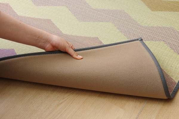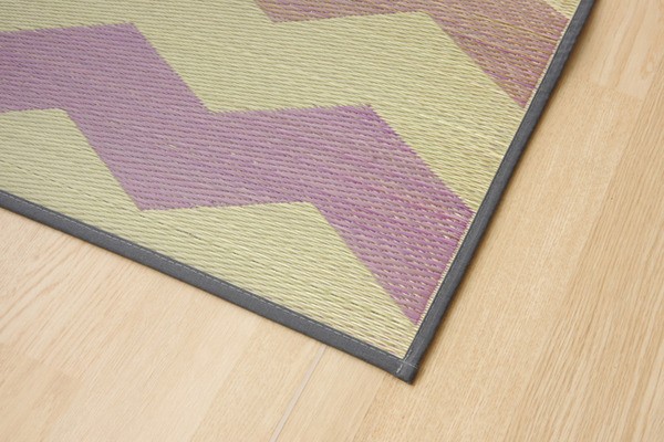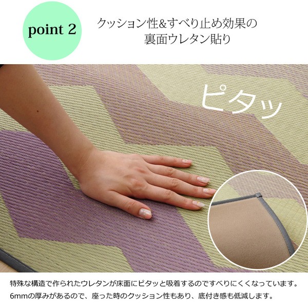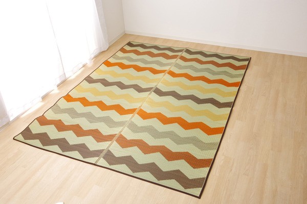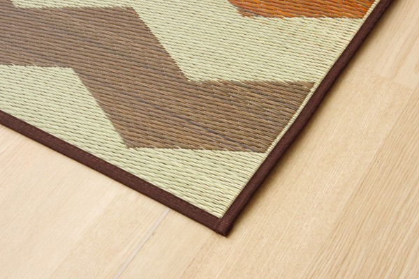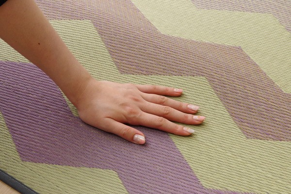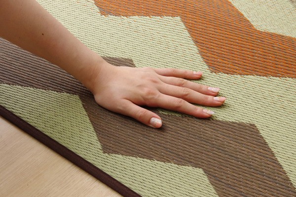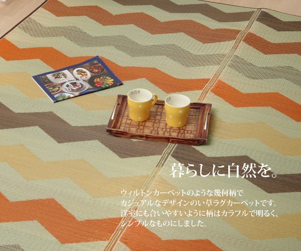 ウィルトンカーペットのような幾何柄でカジュアルなデザインのい草ラグカーペットです。フローリングでもご使用できるよう、裏地にはウレタンフォームを使用しているためクッション性のある商品です。洋室にも合いやすいように柄はカラフルで明るく、シンプルなものにしました。国産(九州産)のい草を使用しています。一本一本が太く、表皮が厚く繊維がキメ細かいので弾力性があり、耐久性に優れています。い草には空気の自然浄化作用、湿度の調節作用などがあります。また汚れにくく、使用するうちに黄金色に変化し味が出ます。い草に青森ヒバ加工を施しています。(抗菌、防臭効果)