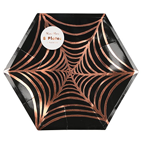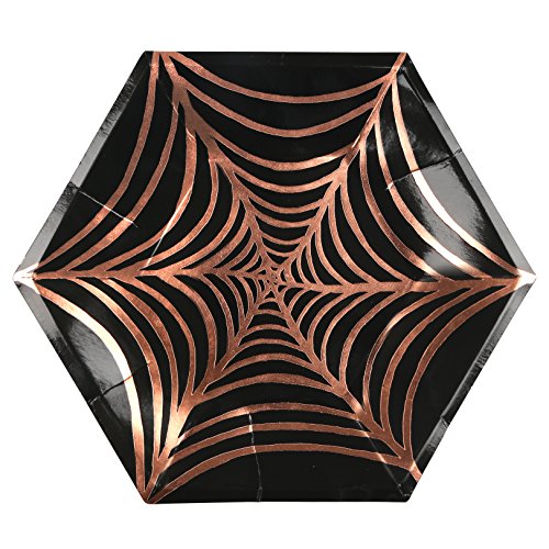 - A spooky large plate for a Halloween party featuring a ghastly spider's web embellished with shiny rose gold foil.