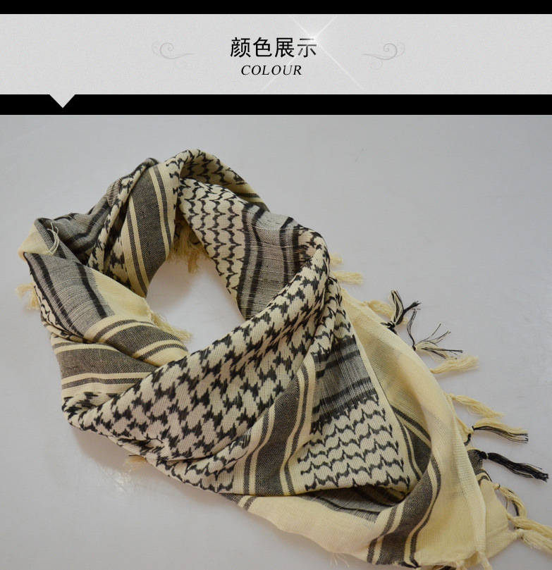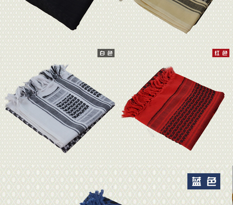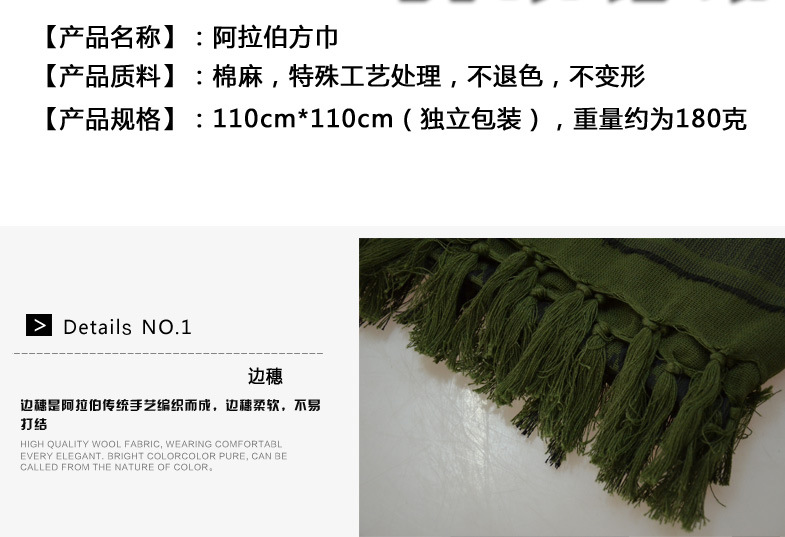 Arabian square towel with cotton yarn, the traditional weaving process to create excellent quality.This kind of scarf has become a special case in the textile industry, its unique edge ear is also a unique process of identification.