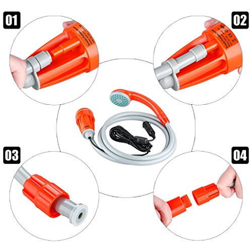 Portable Camping Shower: the unit consists of a powerful shower head on one end and a water pump on the other end with a S-hook, a suction cap, a 3M power cord and a 1.8M hose