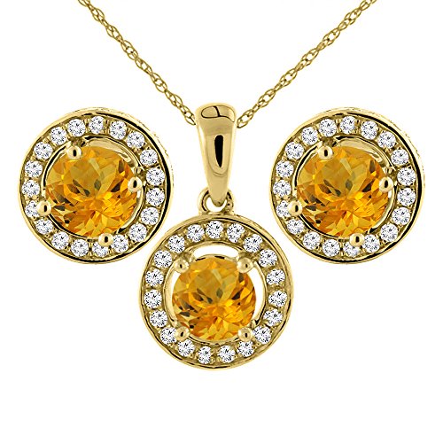 -. Title : 14K Yellow Gold Natural Citrine Earrings and Pendant Set with Diamond Halo Round 5 mm
