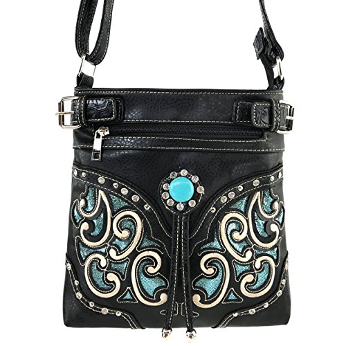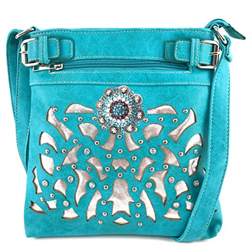 -. Brand : Justin West -. Color : Beige -. Department : womens -. Feature : Handbag Measurements: 11" X 11" X 2" / Round Turquoise Stone with Clear Rhinestones / Interior Features Compartments and Pockets / Back Concealed Carry For Small Gun Pocket and Phone Slot Pocket / Adjustable Cross Body Strap -. Model : MsgPrsBPink -. PackageQuantity : 1 -. ProductGroup : Shoes -. ProductTypeName : HANDBAG -. Title : Justin West Tooled Gleaming Turquoise Stone Floral Laser Cut Rhinestone Messenger Bag Purse with Long Cross Body Strap