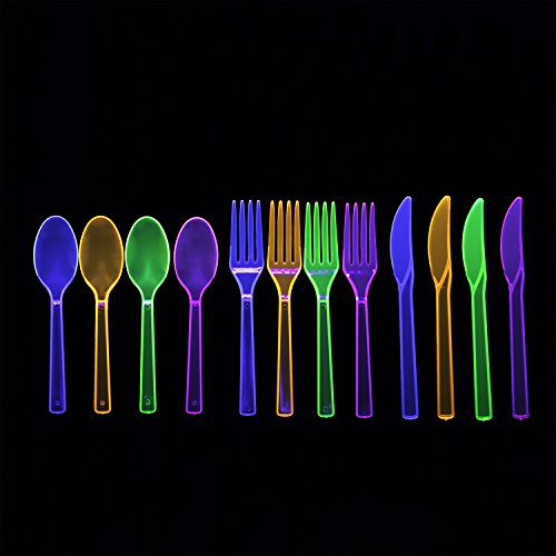 - 24 packs of 48 assorted neon plastic cutlery, in colors that include blue, green, orange and pink