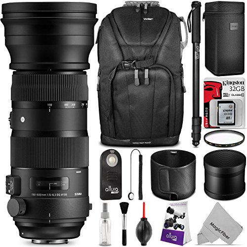 -. Feature : KIT INCLUDES: Sigma 150-600mm f/5-6.3 DG OS HSM (S) Sport Super Telephoto Zoom Lens + Vivitar DSLR and Laptop Backpack + Pro 67" Monopod + 105MM UV Filter + Kingston 32GB C10 Micro SD Memory Card w/ Adapter + Altura Photo Wireless Remote Control + Altura Photo Cleaning Kit. / HIGH ACTION-CAPTURE PERFORMANCE LENS: Super Multi-Layer Coating, Hypersonic Motor AF System, Optical Stabilization, One SLD and Four FLD Elements, with Maximum Aperture Range of f/5-6.3. / COMPATIBLE with the Enthusiast APS-C CANON EOS 7D, 7D Mark II, 60D, 60Da, 70D, and Rebel T1i, T2i, T3, T3i, T4i, T5, T5i, T6i, T6s, SL1 DSLR Cameras. Also compatible with CANON Full Frame 5D Mark II, 6D, 1D X, 1D C, 5D Mark III, 5DS and 5DS R.