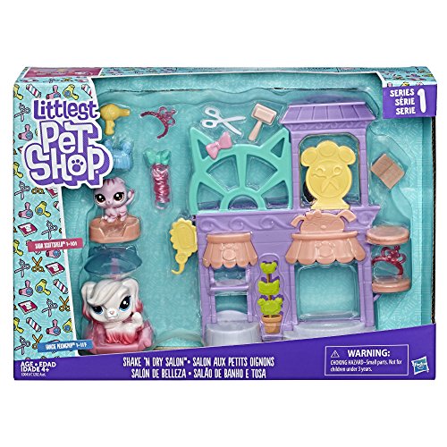 When pets want to get their glam on, they’ve got only one destination in mind -- the Shake ‘n’ Dry Salon! Where else can a fashion-forward pet sit in a comfy chair and order “the works”? Whether customers need just a quick trim or a completely new ‘do (topped with a tiara, naturally), they can relax with a magazine or share some juicy gossip with their friends. This stylin’ playset comes with 2 pets (a Pekingese pup and a Scottish Fold cat) and fun accessories to help every pet look their best, including 2 tiaras, a wig, scissors, a brush, and a hair dryer. Styling chair holds any size pet, and the playset itself holds up to 15 pets. (That’s one busy day at the salon!) Littlest Pet Shop and all related characters are trademarks of Hasbro.Feature