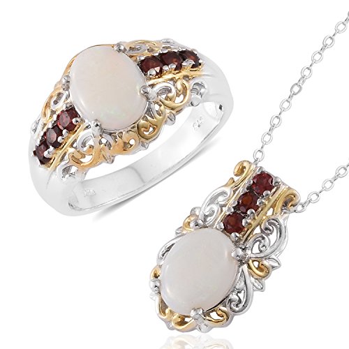 -. Binding : Jewelry -. Brand : Shop LC -. Department : womens -. Feature : This design is simple, classic fit for any occasion as daily wearing home and office / It is a great present for a birthday,wedding or another significant event / It will brighten up your look more charming on the wedding,party or other occasion. -. Label : Shop LC -. Manufacturer : Shop LC -. Model : 2805138 -. MPN : 2805138 -. PackageQuantity : 1 -. PartNumber : 2805138 -. ProductGroup : Jewelry -. ProductTypeName : FINEOTHER -. Publisher : Shop LC -. Studio : Shop LC -. Title : White Opal, Garnet 14K Yellow Gold and Platinum Plated Silver Ring Size 6 and Pendant With Chain 20 in