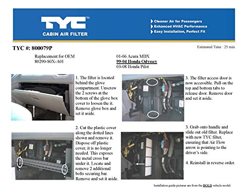Studio : TYC Publisher : TYC Binding : Automotive Product Description Pollen, allergens, various fuel-based contaminants from the outside road environment all pass into and are filtered by your vehicle's Cabin Air Filter, or CAF. A TYC CAF is designed to have the same or better filtration efficiency as the original equipment filter: its identical dust load capacity ensures the same amount of particulate-collecting power, while factory-correct level of pressure drop ensures proper air flow through the vehicle's cabin. Each TYC CAF also comes with step-by-step installation instructions for ease of replacement. 0