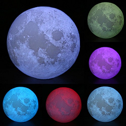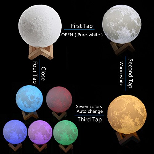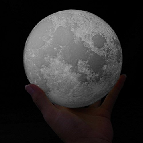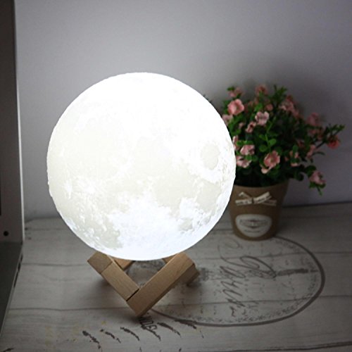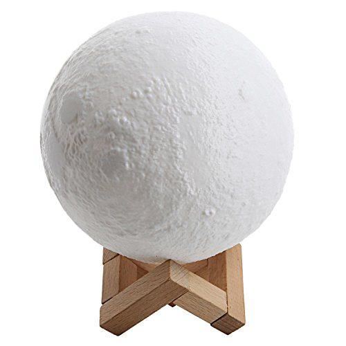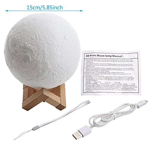 -. Feature : ☀3D PRINTING NIGHT LIGHT -- The application of innovative 3D Printing technology restores the real appearance of the moon vividly, which make this night Moon lamp stands out from other night light, table lamp or desk lamp / ☀TOUCH SWITCH DESK LAMP -- The use of digital stepless dimming technology let you control the lamp easily by hand. Touch light to switch the lighting color and brightness from pure white or warm white color to rainbow color / ☀RECHARGEABLE NURSEY LAMP -- Built-in rechargeable battery provides 4-10 hours' illumination. It can be connected to PC, Mobile phone charger or power bank with the USB Charging port and cable line. Adjustable lighting color between warm white and pure white ceats an ideal sleep atmosphere for your baby and kids / ☀SPECIAL GIFT IDEA -- This Moon Light can a special gift inspiration for your friends, kids and family members on Christmas, birthday party, wedding or anniversary. Fits to home, kid's bedroom, living room, dining room, office, college dorm and creates a wonderful atmosphere beyond your expectations / ☀WHAT YOU GET -- 1 x LED Table Lamp, 1 x Wooden Base, 1 x Strap, 1 x USB Cable, 1 x User Manual. Charging Time: 2-3 hours, Working Time: 4-12 hours. Ship from US warehouse and will arrive in 4-8 days