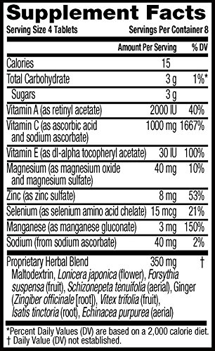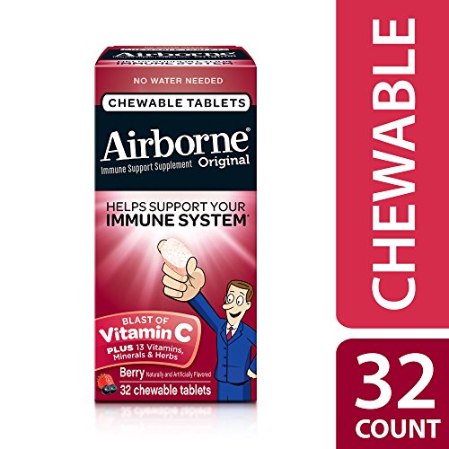 Airborne Chewable Tablets provide real immune support in a great-tasting and easy-to-take form; no water needed. Each serving (4 tablets) delivers a blast of 1000 mg of Vitamin C plus 13 other immune system supporting vitamins, minerals, and herbs, including Echinacea, ginger, and other herbal extracts from whole plant materials.* Same immune support found in Airborne Effervescent Tablets and Gummies. Take up to 3X per day as needed. Gluten Free & No Preservatives. *These Statements have not been evaluated by the Food and Drug Administration. This product is not intended to diagnose, treat, cure or prevent any disease.Feature