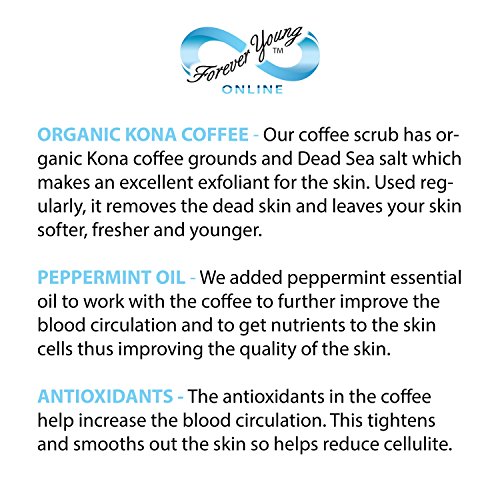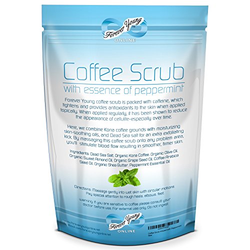 -. Binding : Misc. -. Brand : Forever Young Online -. EAN : 0717416667153 -. Feature : ORGANIC KONA COFFEE - Our coffee scrub has organic Kona coffee grounds and Dead Sea salt which makes an excellent exfoliant for the skin. Used regularly, it removes the dead skin and leaves your skin softer, fresher and younger. / PEPPERMINT OIL - We added peppermint essential oil to work with the coffee to further improve the blood circulation and to get nutrients to the skin cells thus improving the quality of the skin. / ANTIOXIDANTS - The antioxidants in the coffee help increase the blood circulation. This tightens and smooths out the skin so helps reduce cellulite. / BETTER VALUE - Our full 16 oz. bag of coffee scrub with essence of peppermint is twice the size of other coffee scrubs so it is a much better value. / FREE EBOOK - We offer a FREE EBOOK with every purchase! -. IsAdultProduct : 0 -. MPN : 717417000000 -. PackageQuantity : 1 -. PartNumber : 717417000000 -. ProductGroup : Office Product -. ProductTypeName : OFFICE_PRODUCTS -. Title : 16 Oz Organic Coffee Body Scrub with Dead Sea Salts and Essence of Peppermint Oil - FREE EBOOK - Promotes Natural Collagen Production, Exfoliates Skin, Reduces cellulite and stretch marks -. UPC : 717416667153