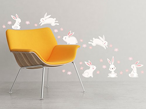 - PRODUCT DIMENSIONS - Set of 7 Bunny Rabbits and 24 Flowers, Bunny Rabbits (range) - 6" - 8" wide x 6" - 9" tall, Flowers - 1.5" wide x 1.5" tall (each) . Matte finish looks like a painted mural on your wall and leaves no sticky residue