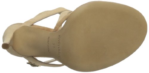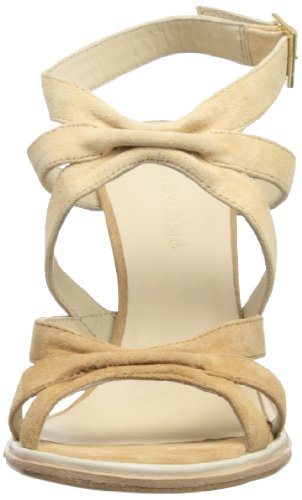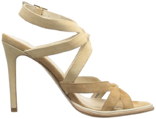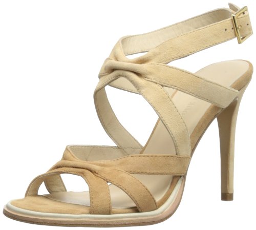 Poised sandal featuring subtle two-toned color blocking and pinched pleats where straps meet