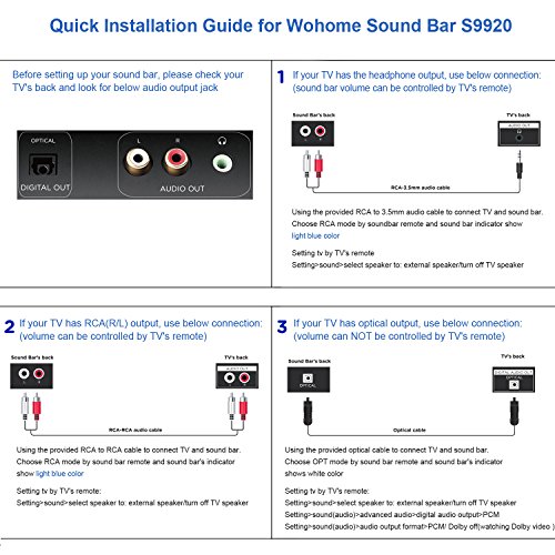 3, For Optical connection, please change your TV audio output to PCM(PCM is a form of digital signal that is used to represent analog data, and is an optional audio format on many televisions, please see the Sixth image to find the method).