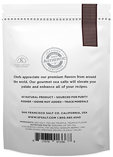 KOSHER CERTIFIED - Our Italian Black Truffle Sea Salt is Kosher Certified, Non-GMO, and does not contain any MSG, Soy, Gluten, Dairy, or anti-caking agents. We package in our U.S.A, GMP certified packaging facility that is 3rd party audited, by SCS Global. Crafted in the USA.