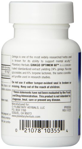 ReleaseDate : 2015-06-22 Studio : Planetary Herbals Publisher : Planetary Herbals Binding : Health and Beauty Product Description Ginkgo is one of the most widely researched herbs and is known for its ability to support mental acuity. Planetary herbals ginkgo optimem 120 is a concentrated standardized extract yielding 24% ginkgo flavone glycosides and 6% terpene lactones, the same constituent profile used in research studies. 0